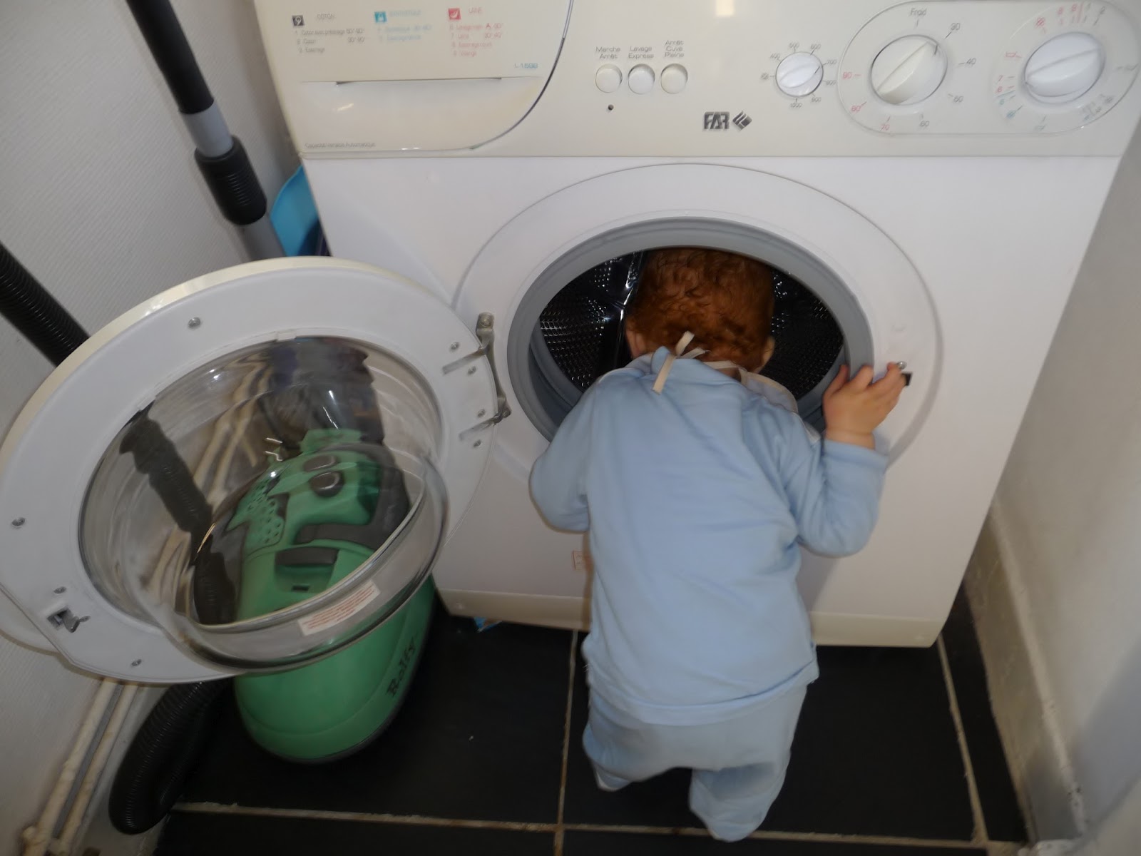 J’ai parfois l’impression que l’aspirateur, le lave vaisselle, le lave linge, la cuisinière etc… sont les meilleurs amis de Petit Baroudeur.
