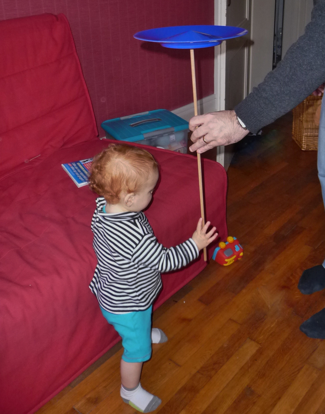 • Mais les assiettes chinoises, c’est bizarre, ça quand même ! ça a commencé de manière anodine…EPP a retrouvé une assiette chinoise et la baguette associée, bien rangée je ne sais où… vestiges d’un passé fort lointain ( hum ! )…et pour distraire l’estomac affamé de Petit Baroudeur, il a tenté une petite démo..EPP est très doué !!  Résultat : Petit Baroudeur fasciné…