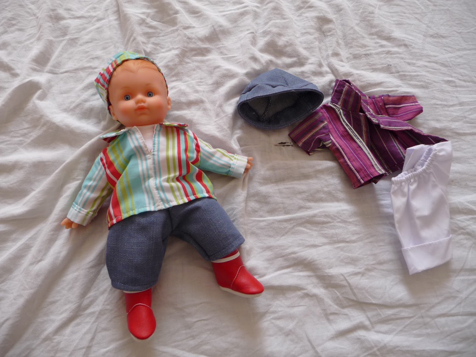 Petit Baroudeur m’amène régulièrement Poupon pour que nous jouions ensemble et aime par dessus tout faire tout ce que je propose à Poupon : cavaler sur la peluche cheval, se cacher, faire une balade en chariot de marche…et toujours lui enlever et remettre chaussures et chapeau…on a même essayé la chemise à Doudou Lapin…et là, non..ça ne lui allait pas du tout, Petit Baroudeur lui a enlevé Fissa !