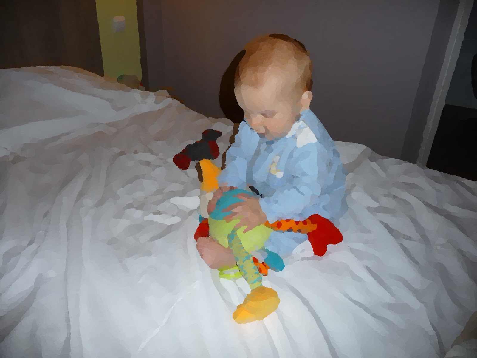 Et il faut que je vous dise….j’ai découvert de nouvelles choses: je sais faire « bravo » quand je suis content, et « les marionnettes » quand je veux que Maman chante. Je m’applaudis moi-même quand j’arrive à faire quelque chose de nouveau comme ouvrir la barrière de la cuisine si elle n’est pas verrouillée et entrer dans la cuisine…ou quand je tiens debout sans appuis, alors là je suis fier et en même temps j’ai du mal à y croire. Je marche si je peux me tenir à quelque chose avec mes deux mains, et depuis quelques jours, je m’essaie à marcher en me tenant avec une seule main et même je peux faire un pas sans aucun appui.